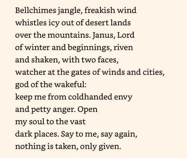 I love this one and had never thought of Janus/Ianus in this way. Like, I knew there were two faces but I never connected that with looking backwards and forwards at the same time!